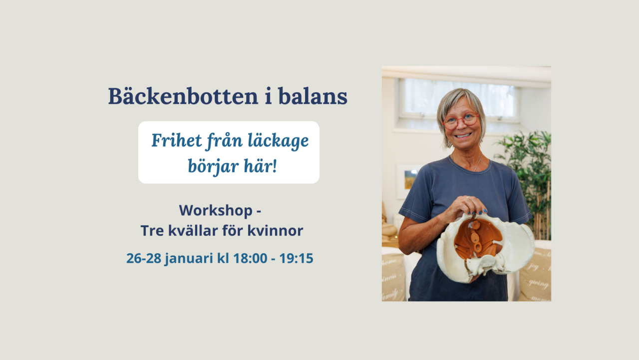 Den här 3-kvällars workshopen är mitt sätt att visa att förändring är möjlig – och hjälpa dig ta första steget mot trygghet, kraft och balans i din bäckenbotten. Varmt välkommen! / Irene